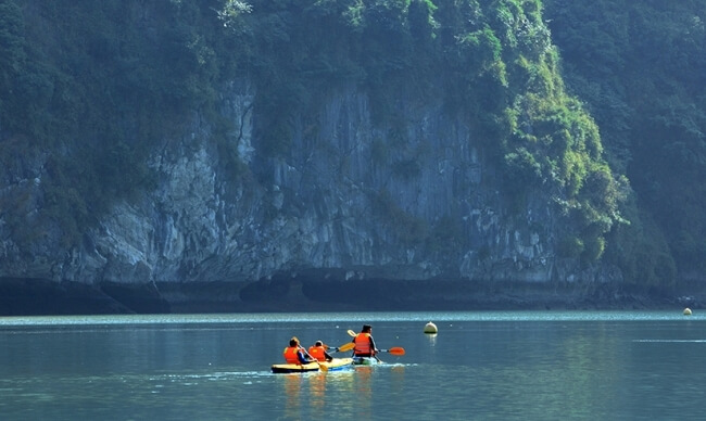 Located at the east of Cat Ba Archipelago, Lan Ha bay is a peaceful area features more than 400 islands, islets and 130 golden beaches, which depicts an astonishing landscape image. Ao Ech area is one of many tourist attractions in Lan Ha bay, which is well-known with the untouched beauty and quiet. The area portrays a wild scenary formed by limestone islands surrounded by jade green water and deserted beaches. Besides, Ao Ech is also an ideal place for relaxing, sightseeing, swimming, especially kayaking. Discovering Lan Ha bay by kayak will give you unique experience that other cruises can not deliver. Sailing through islets, caves by kayak allow you to approach to the mountain easier and open chances to explore lively natural scene.