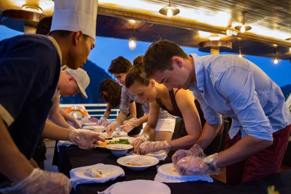 18:00- 18: 30 Join the cooking class guided directly by Chef of Alisa Cruise. You have a chance to practice Vietnamese traditional dishes such as spring roll or famous cuisine of Vietnam.