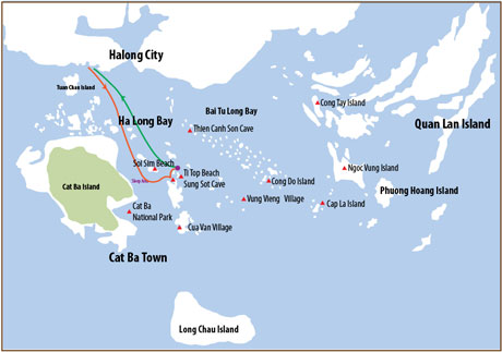 9:30: On the way back to Halong city, Annam Junk continues to explore Halong bay on the most wonderful route: Dinh Huong island, Ga Choi Island, Dog Island, Sail island. Binh Phong mountain, Man’s head island, Tortoise island.