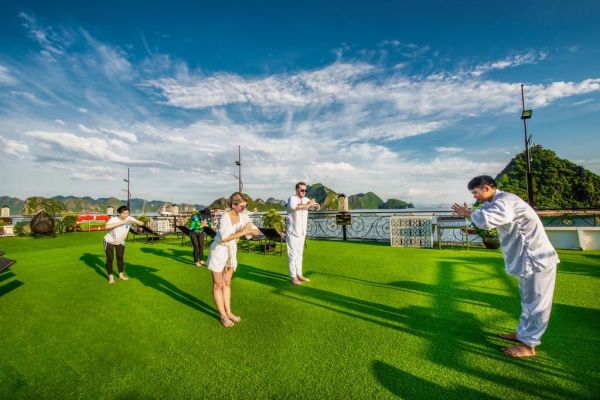 6:15 Warm up your day with a Tai Chi lesson on the sundeck with a breathtaking view as the sun rises on Halong Bay.