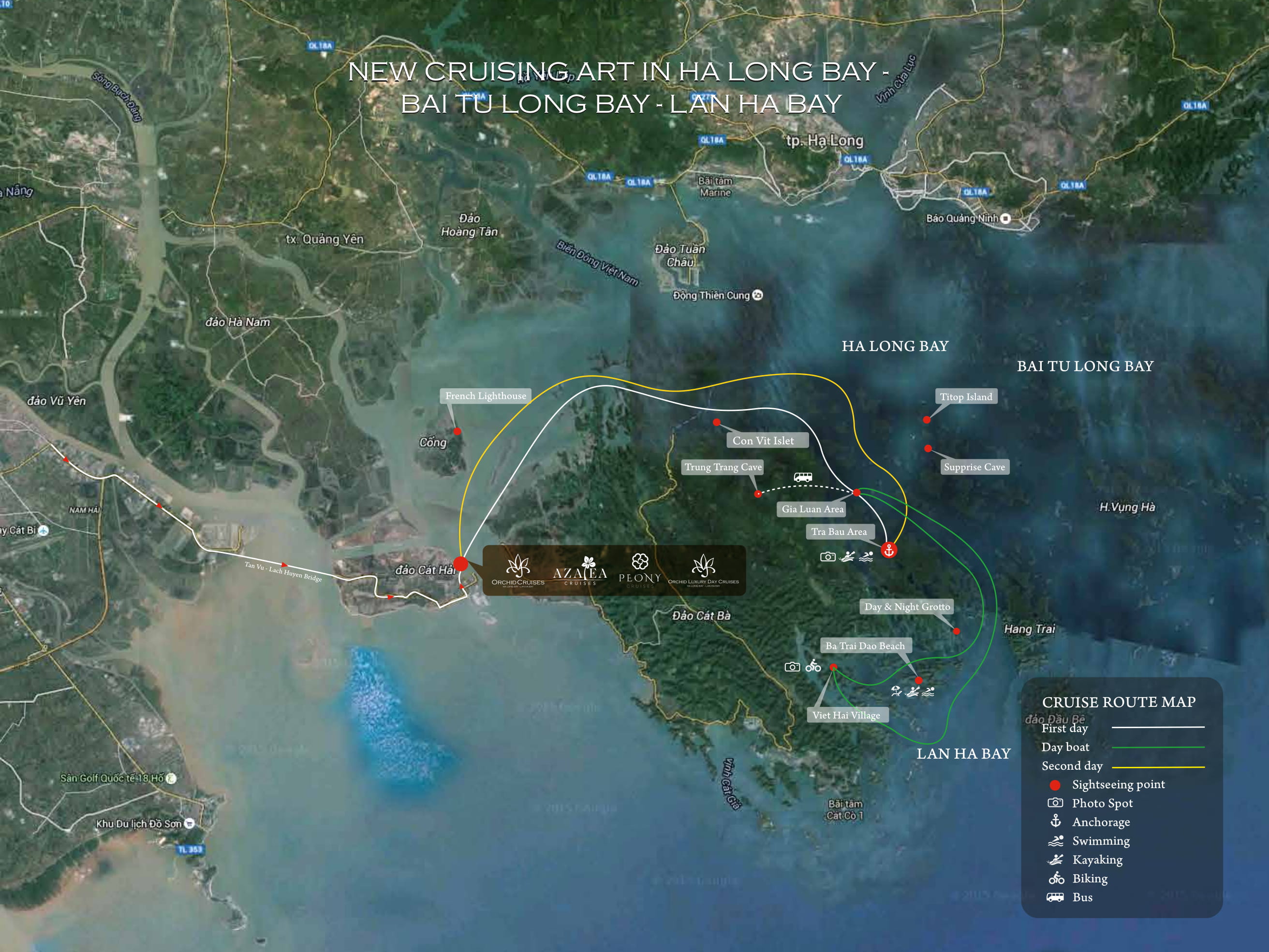 Destination: * Ha Long Bay – Lan Ha Bay * Dinh Vu Port * Cai Trap Canal, Trung Trang valley * Da Chong Islet * Cua Van Area * Ba Trai Dao beach * Bbiking in Viet Hai Village, Cat Ba island * Dark & Bright Cave