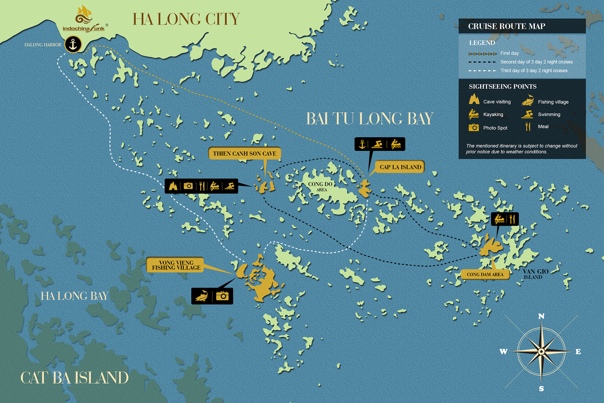 • Please note that the time may be changed depending on the policies of Halong bay management or weather permission. We will inform you before getting on the cruise.
