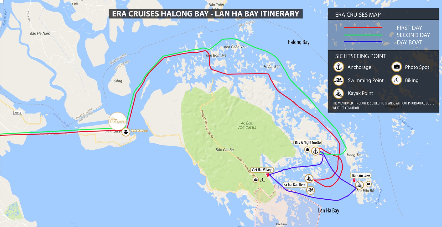 Destination: Ha Long Bay – Lan Ha Bay Got Port Cai Trap Canal Da Chong Islet Cua Van Area Ba Trai Dao beach (Lan Ha Bay) Dark & Bright Cave Biking in Cat Island and visit local village