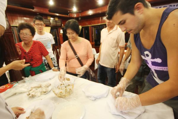 Day 1: Welcome aboard and sail through the World Heritage Site-Halong Bay, visit Tien Ong Cave, pass through ancient Cua Van Fishing Village and sharpen their culinary skills at our cooking class