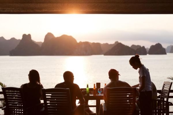 15h00: Return to cruise. Enjoying swimming at the untouched area. Then, you will join a traditional cooking class. Our chef will instruct you in the making of some Vietnam dishes. Watch the magnificent sunset over the Gulf of Tonkin. In the early evening the boat has its Happy Hour deal