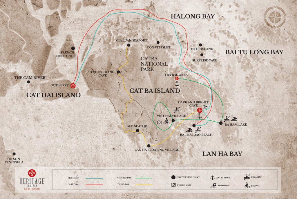 15:30 The cruise vessel approaches the Ba Trai Dao beach (Three Peach beaches) in Lan Ha Bay, a natural frontier between the provinces of Halong and Haiphong. This secret hideaway has beaches, caves and coves, plus the spectacular natural beauty of about 400 islands. Guests can try kayaking or simply swim in the clear waters of the bay.
