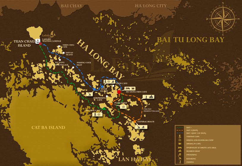 A three day, two night cruise on LaFairy Sails is the perfect choice for you to see the magnificent off-the-beaten-track World Heritage site – Halong Bay and the isolated Lan Ha Bay, and to also get a close look at the area’s unique and spectacular limestone formations and caves. You will visit white sandy beaches, hidden caves, go kayaking, and just relax, all while enjoying the luxury of your comfortable, fully-equipped cruising boat with its well-trained staff and delicious meals.