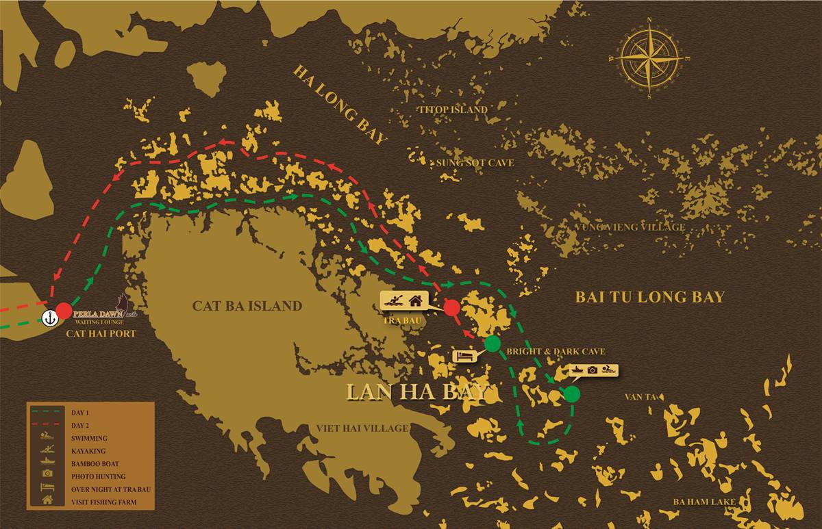 A two day, one night cruise on Perla Dawn Sails to discover Lan Ha Bay is the best choice for those who are looking for a wonder destination where still maintains its primitive natural beauty, less touristic. You will take part in many other exciting activities such as: swimming, cave exploring, dining on top deck, all while sailing through undiscovered waters and islands in the beautiful poetic southern part of Halong Bay.