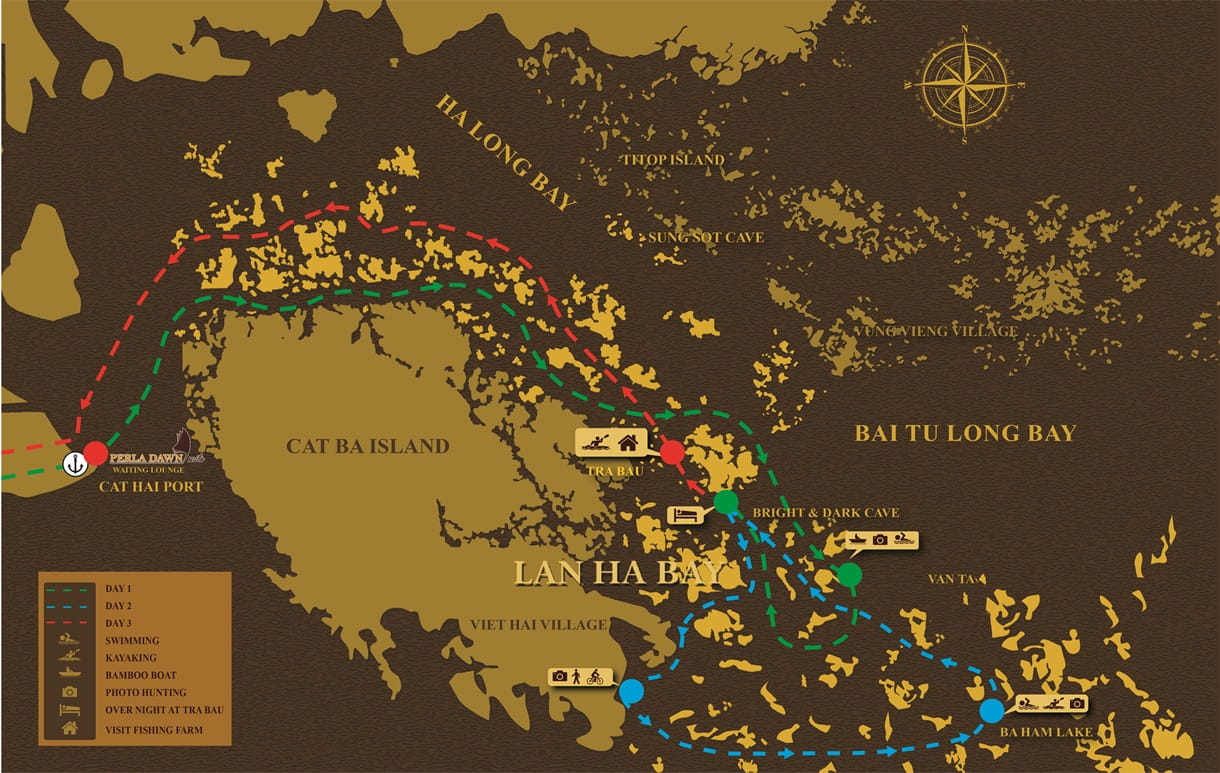 A three day, two night cruise on Perla Dawn Sails is the best choice for those who are looking for an extraodinary adventure to the less touristic of Lan Ha Bay. You will experience many exciting activities such as: swimming, cave exploring, dining on top deck, all while sailing through undiscovered waters and islands in the beautiful poetic Lan Ha Bay.