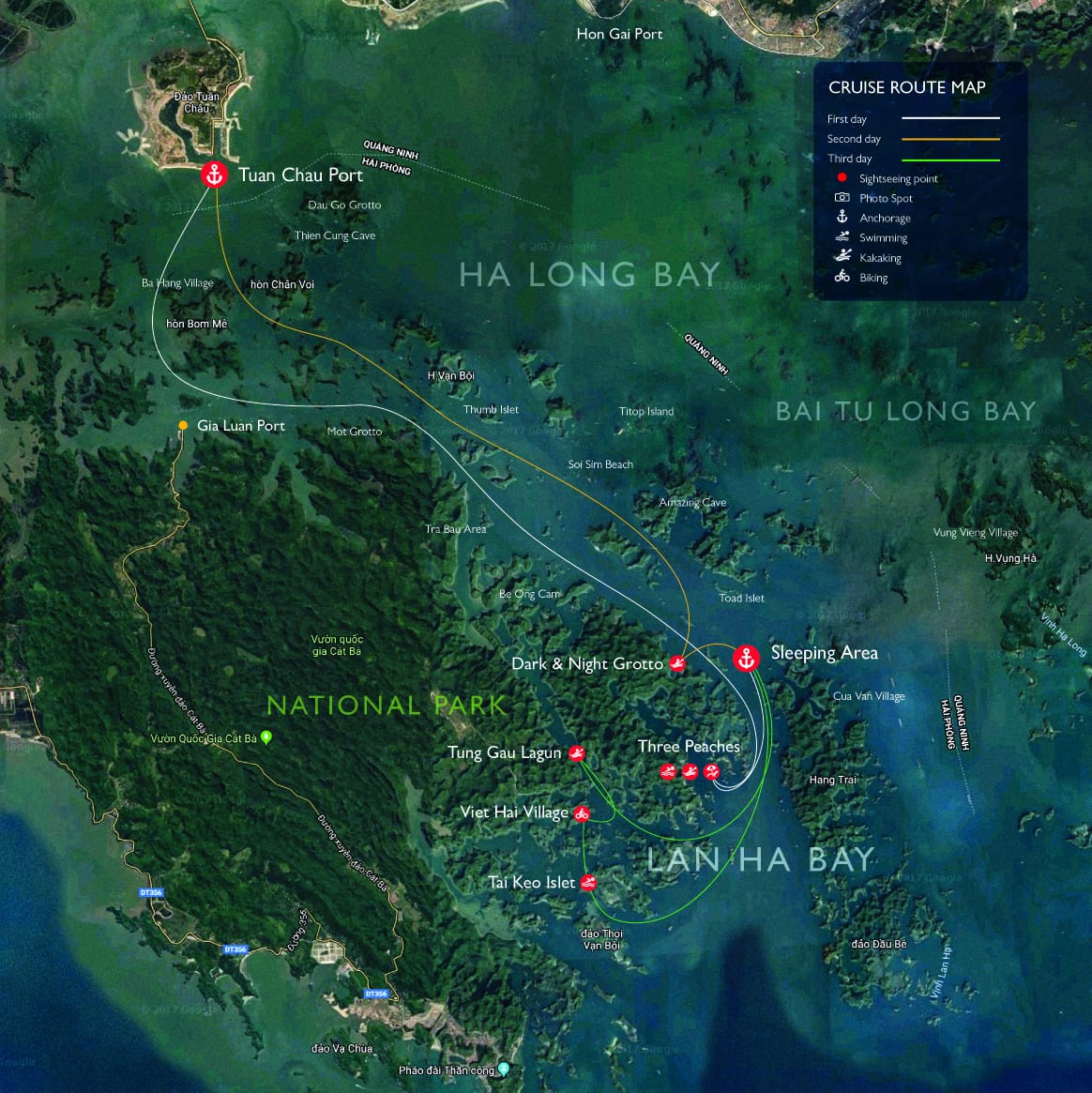 Day One: Hanoi - Tuan Chau marina - Halong bay – Lunch – Swimming at Ba Trai Dao natural beach area (in Lan Ha Bay) – Sunset party – BBQ Dinner – Onboard night activities.