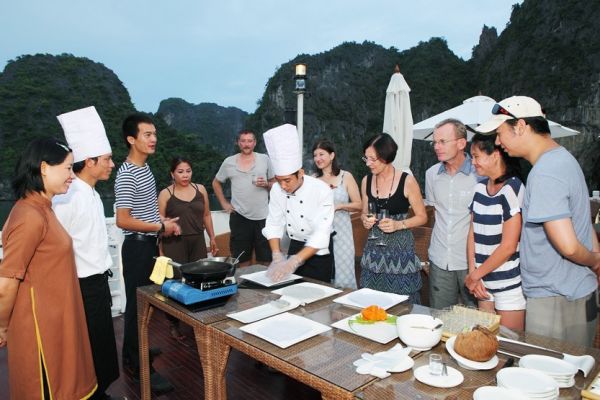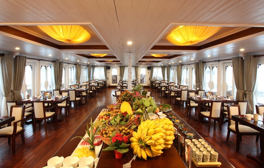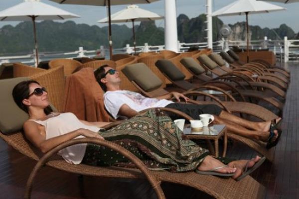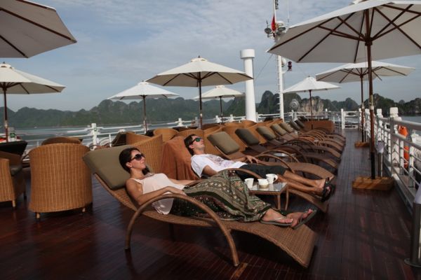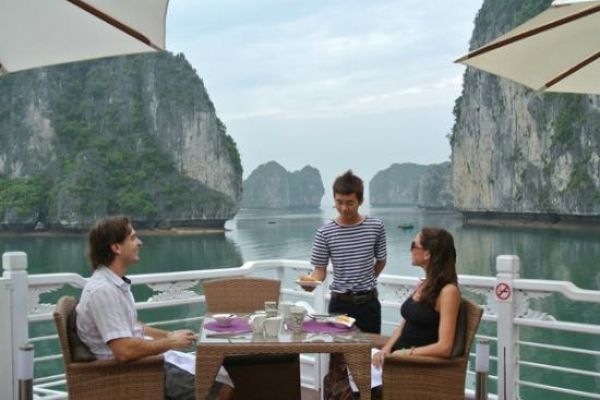 Awake early and join the Tai Chi session on the sundeck or enjoy the breath-taking views of the bay while The Au Co cruises leisurely to a part of Bai Tu Long Bay.
