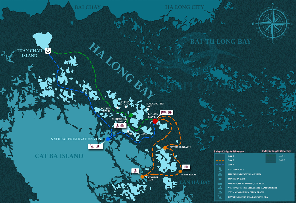 Halong V'spirit Cruise , the word “V’Spirit” actually means “Vietnamese Spirit”, and our goal is to help you experience that feeling which is part of our daily lives. The entire length of our country is next to the sea which feeds us, and on which many of us live and work. Much of our delicious, traditional cuisine is derived from the riches of the sea, and our love of family, friends, and gathering around a good meal shines through in the many tastes of Vietnamese cooking.