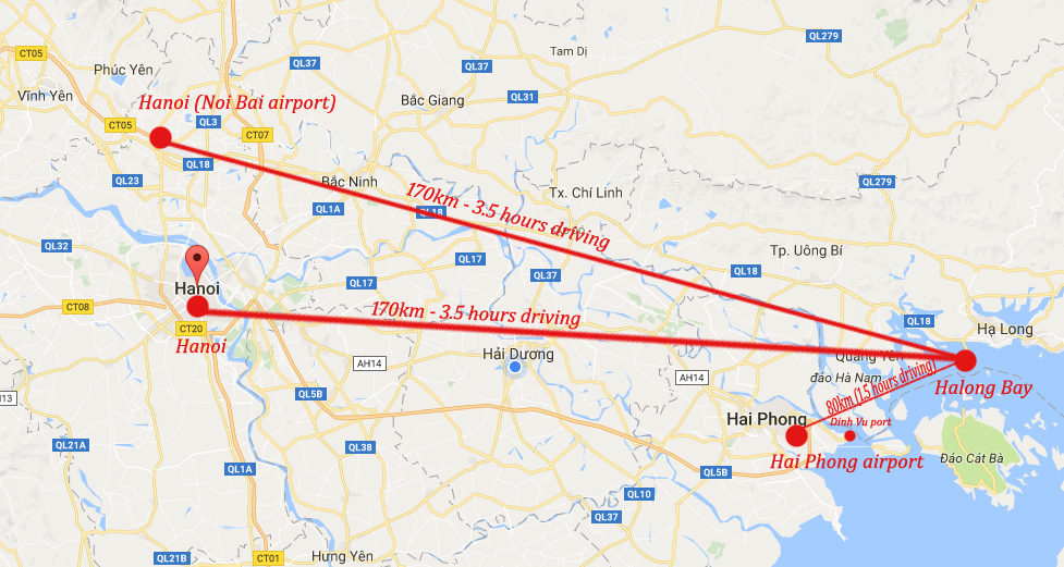 Halong Bay is located 170km from Hanoi city and it takes you about 4 hours by car transfer.