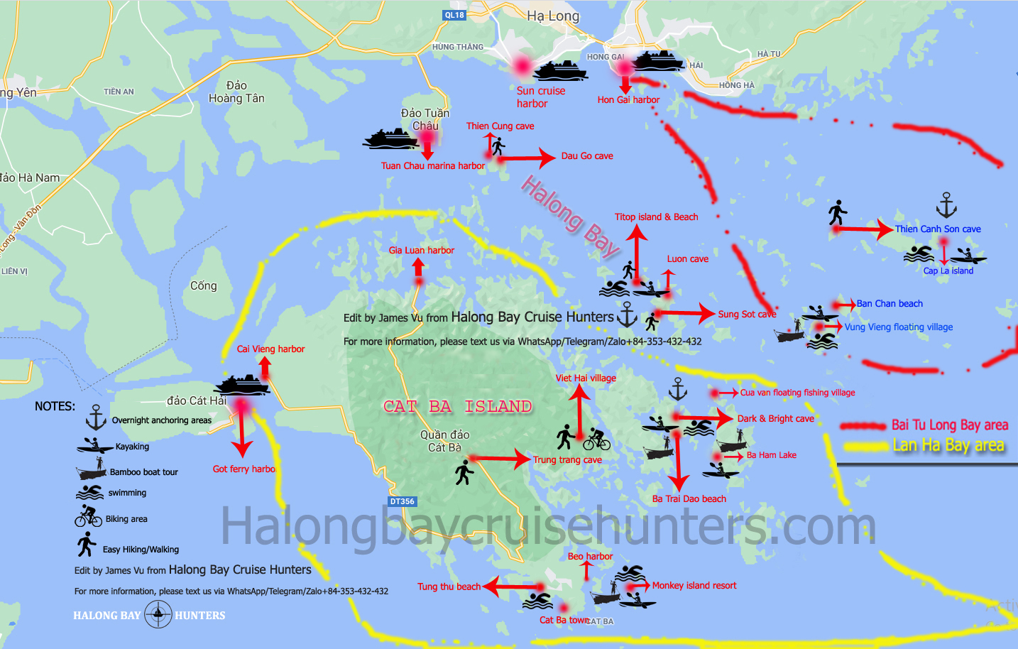 -> 2 days/1night visit: Thien Canh Son cave, kayakind around Vung Vieng floating fishing village, Ban Chan beach.