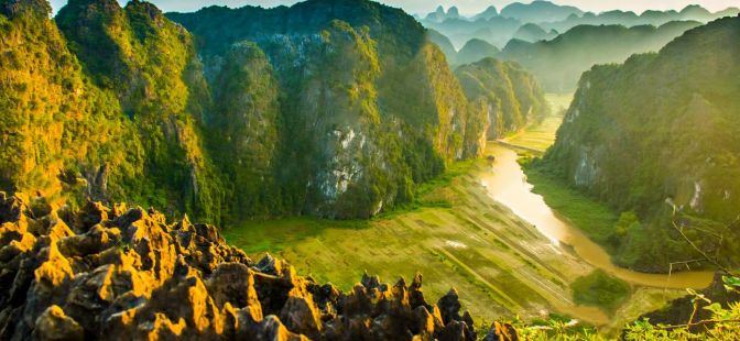 Tam Coc: means three caves - considered as Halong Bay on land, sitting on a boat rowed by local lady in Hoang Long river. Details