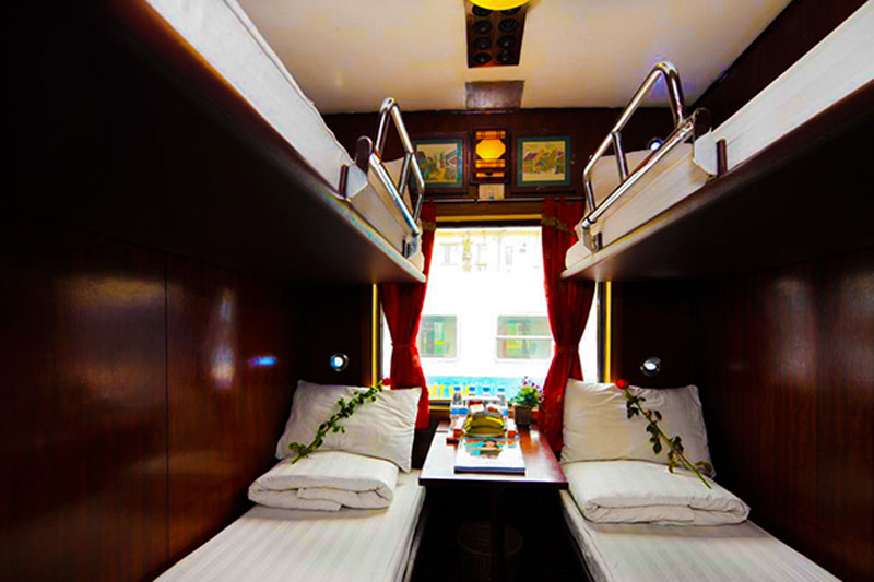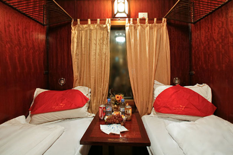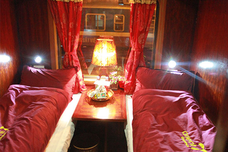 Orient Express train Sapa has luxury wooden carriage, with 2 soft berths called VIP cabin. Each berth is equipped with individual reading lights, baggage storage and spacious trunk for suite case and hand luggage. These cabins are designed to for those who desire to have the privacy with remarkable interior decor.